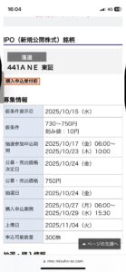 本日発表のIPO「NE(441A)」の抽選結果が出ました。